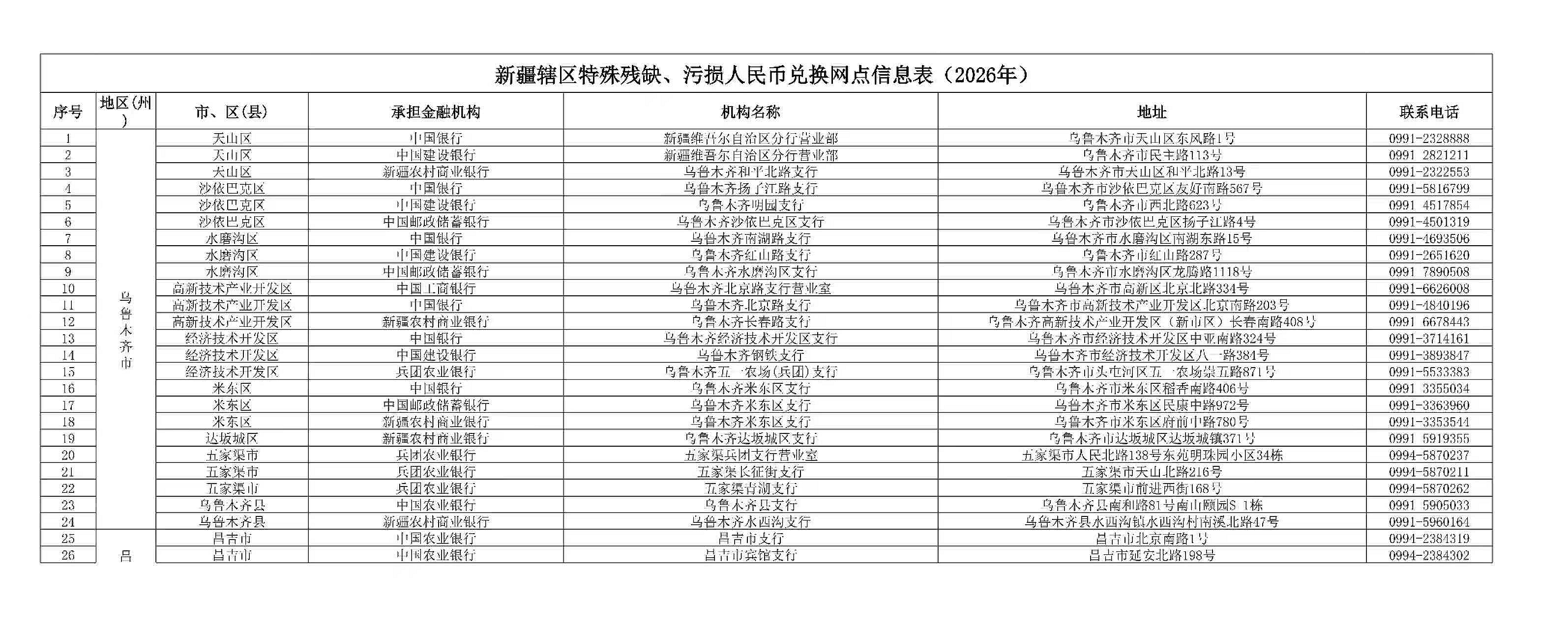 天山网-新疆日报讯(记者王永飞报道)记者从中国人民银行新疆分行获悉:为进一步便利社会公众办理特殊、残缺污损人民币兑换业务,持续优化现金服务,近日,人民银行新疆分行按照合理布局、有效覆盖、便利群众的原则,对新疆辖区特殊残缺、污损人民币兑换网点予以动态调整。