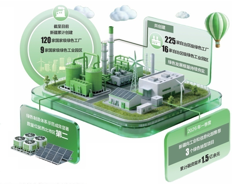 全域推进,久久为功。近日,《自治区用好绿色金融政策支持绿色工厂建设行动方案(2026—2027年)》出台,进一步完善全区绿色金融支持绿色制造示范体系建设工作机制,服务工业经济高质量发展,支持绿色工厂企业采用《绿色金融支持项目目录(2025年版)》中载明的绿色低碳技术实施的投资项目。2026年一季度,自治区工业和信息化厅共向工业和信息化部推荐3个绿色转型项目,累计融资需求1.5亿余元。