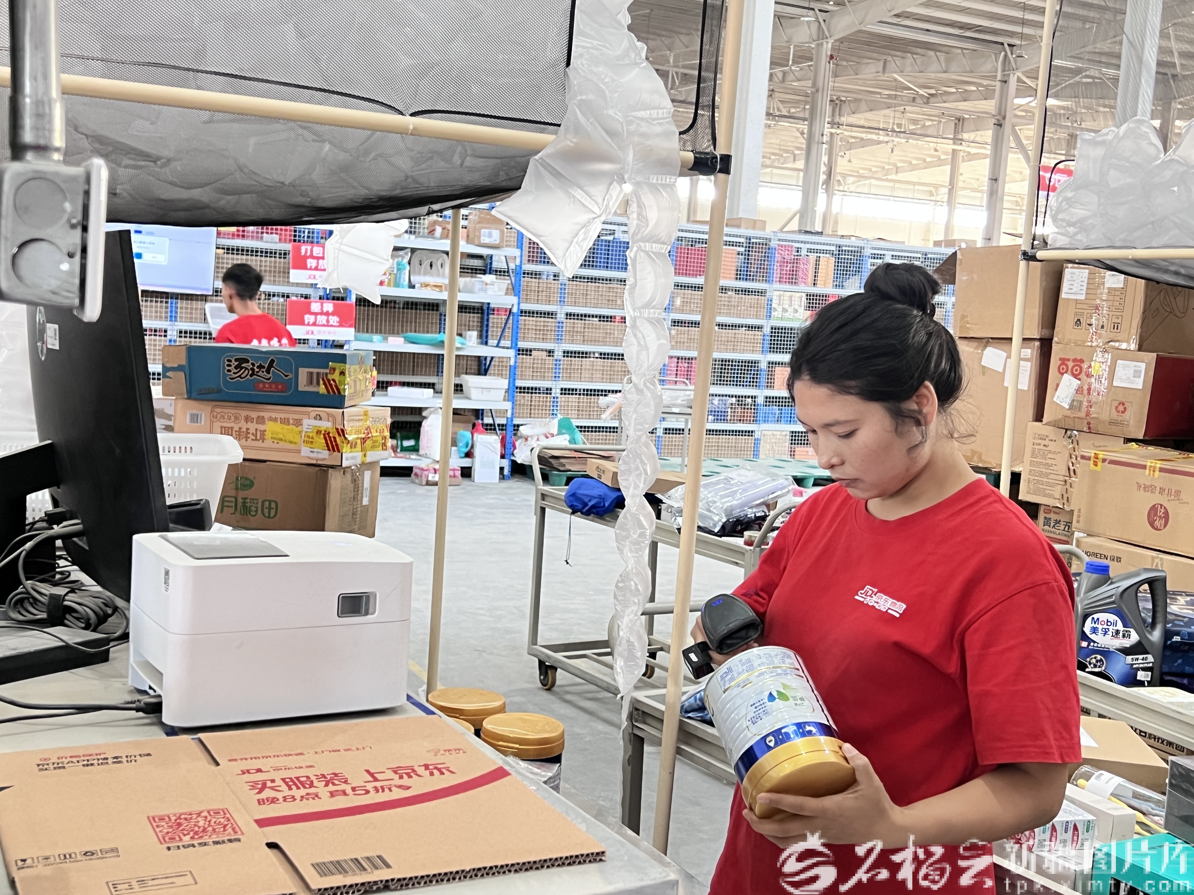 京东物流(喀什)智慧物流港京东仓里,盘点员将快递物品扫码入库。喀什地区邮政管理局供图