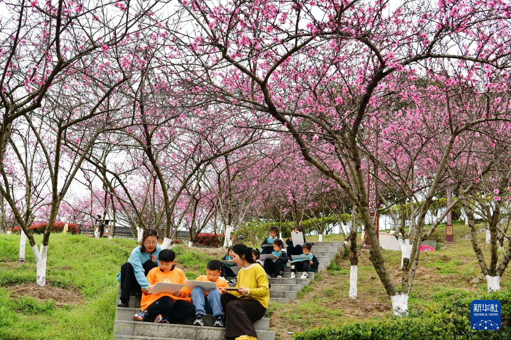 3月21日,孩子们在湖北省宜昌市秭归县屈原故里文化旅游区练习画画。新华社发(王辉富 摄)