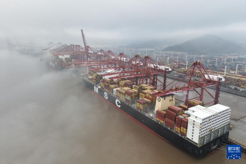 3月29日,货轮停靠在宁波舟山港穿山港区集装箱码头(无人机照片)。新华社记者 黄宗治 摄