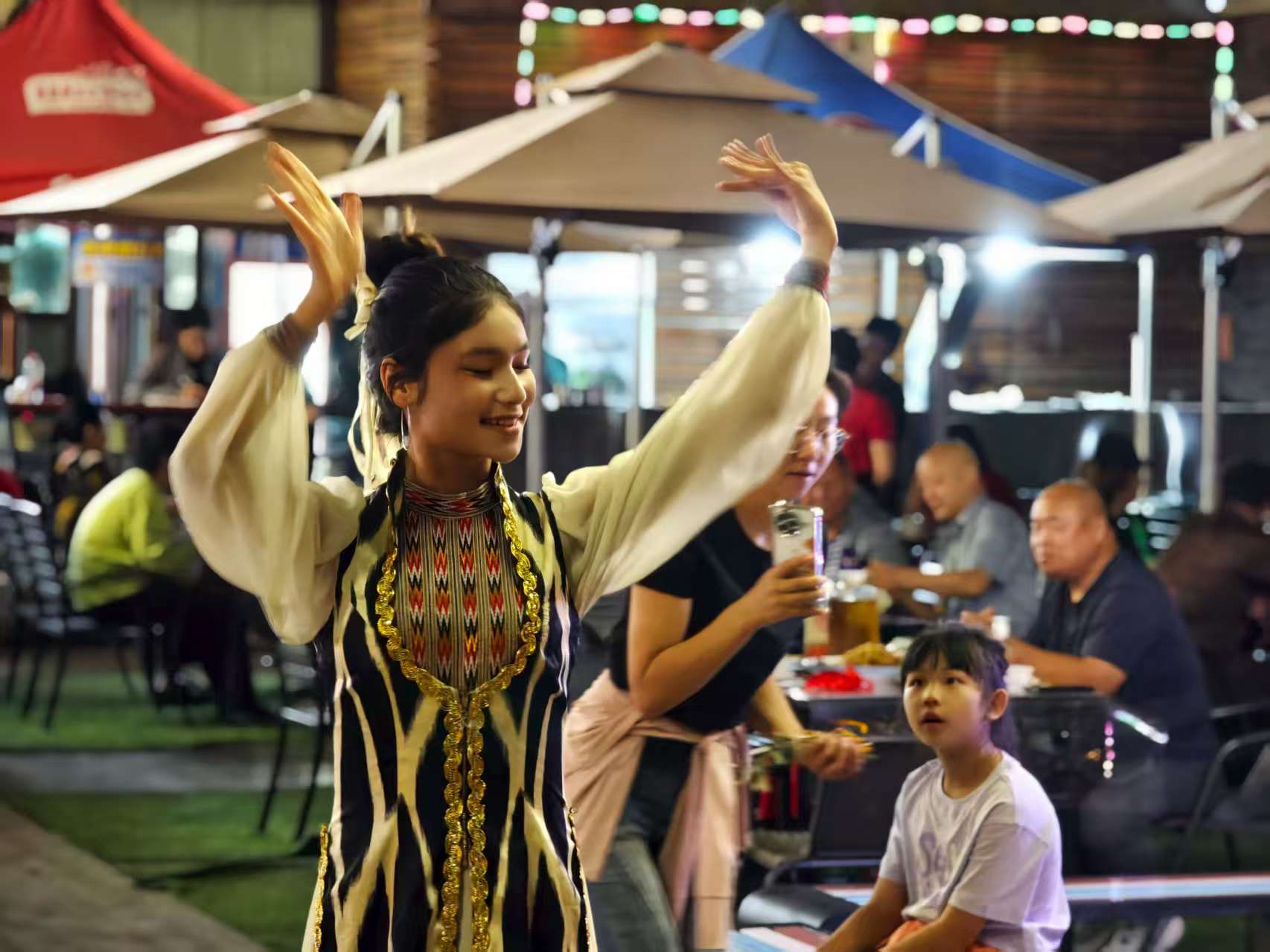 8月28日,在阿勒泰市五百里风情街,“新荣道·新疆菜”的餐饮外摆区,桌椅沿街铺开。烧烤炉前,随着烤肉师傅手腕一翻,十几串烤肉在炭火上打了个滚,油星溅在炭火上冒起白烟,连吹过的风都带着浓郁的羊肉香。