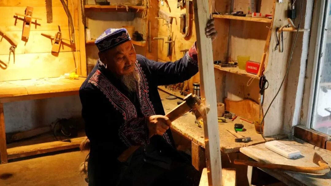走进拉斯特乡古老毛皮滑雪板研习基地,非遗传承人斯兰别克·沙合什正专注切割木材、鞣制毛皮,一块块木材与马皮在他手中逐渐勾勒出古老毛皮滑雪板的雏形。