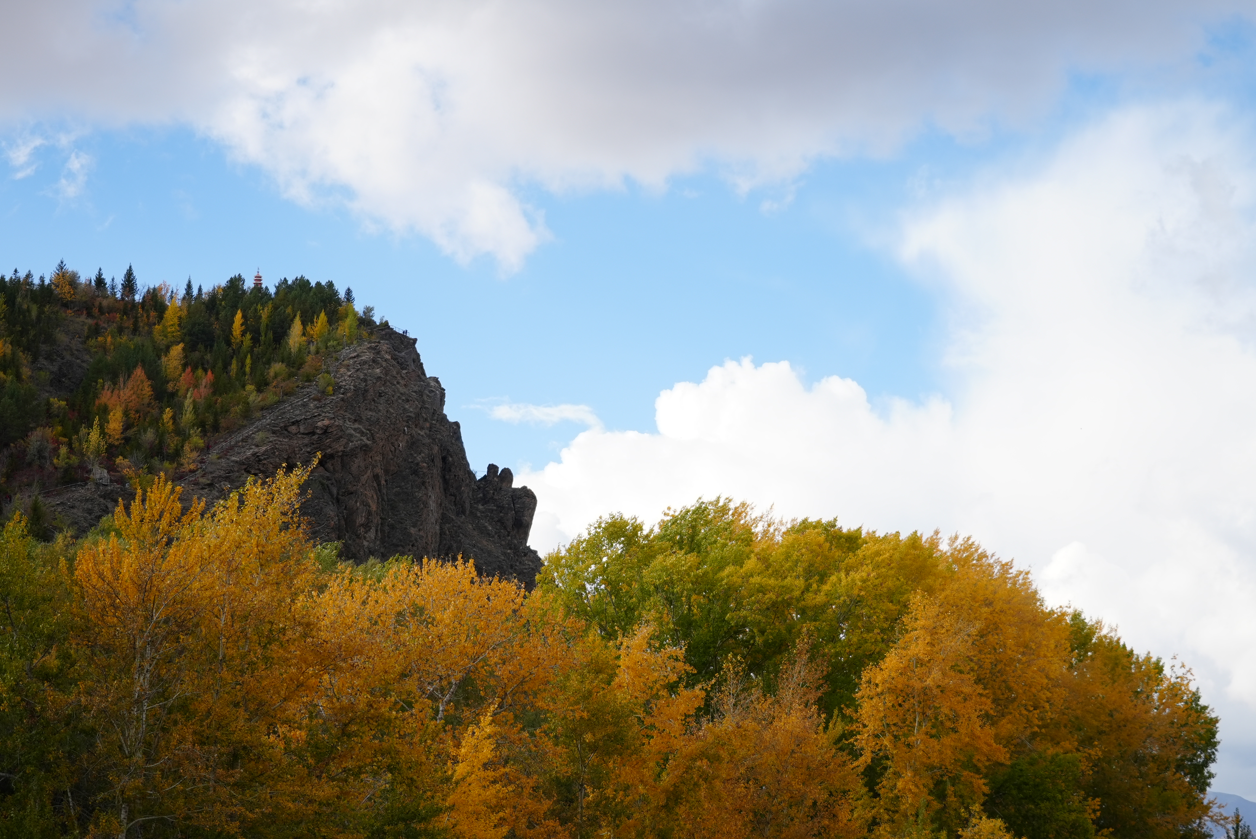 登临驼峰,可见松针墨绿、白桦金黄、野果嫣红,在秋阳下构成一幅流动的油画。山顶俯瞰,阿勒泰市区全景尽收眼底,秋色与城市风貌相映成趣。