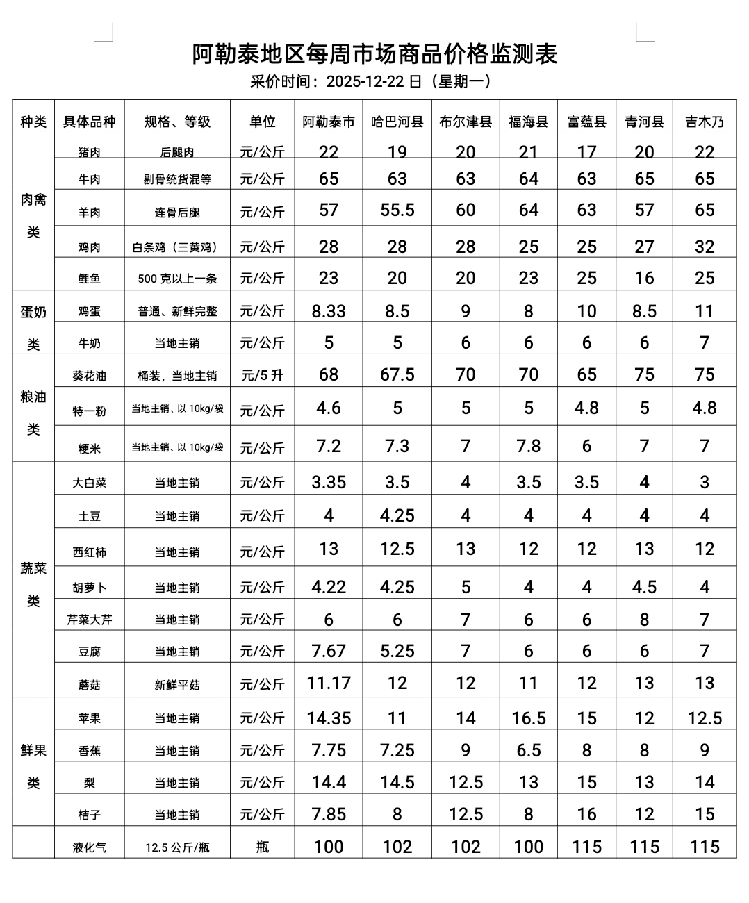 阿勒泰地区每周市场商品价格监测表