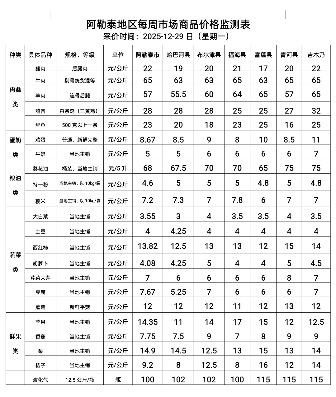 阿勒泰地区每周市场商品价格监测表