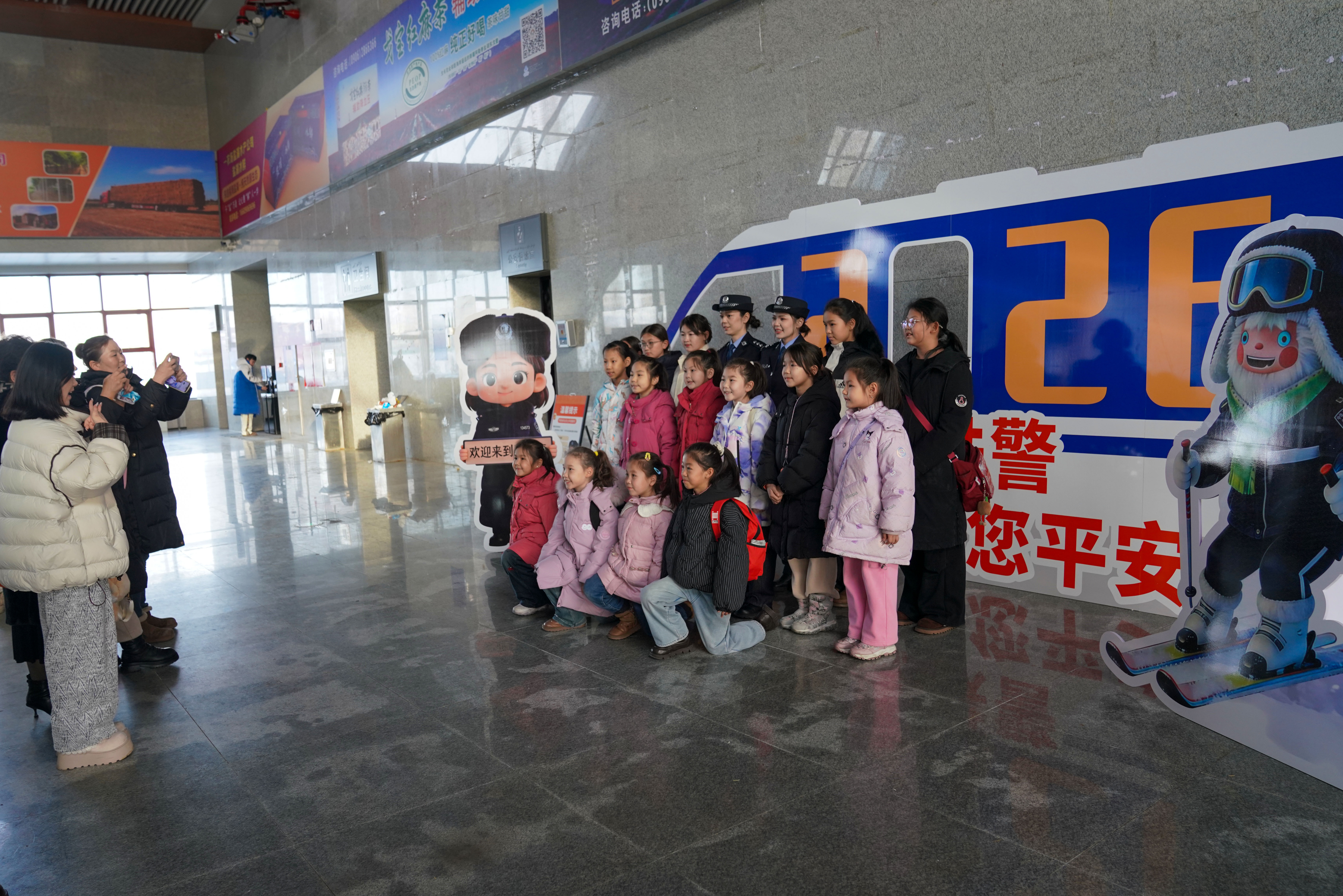 一群小旅客与执勤民警在列车旅游打卡点定格旅途瞬间。通讯员 张艳军摄