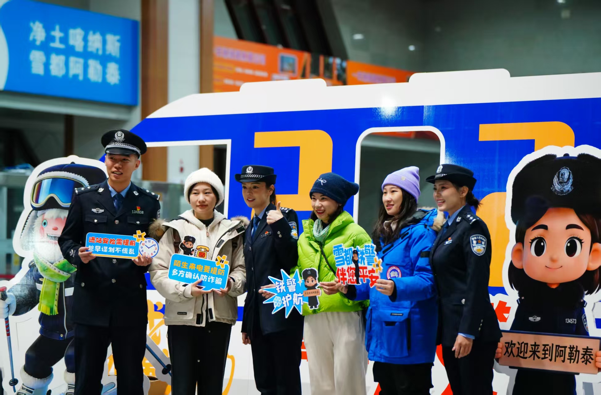 2026年1月1日,迎着新年第一缕阳光,首趟“中国雪都·我的阿勒泰”号列车从乌鲁木齐准点抵达阿勒泰站。乌鲁木齐铁路公安局奎屯公安处阿勒泰站派出所紧扣为民服务初心,营造安全、有序、温馨的旅途环境,提前协调开通地方直达雪场专车、增设雪具临时停放点、打造列车旅游打卡点,为旅客粘贴安全提示卡警民联系贴,设立冰雪旅游便民服务岗,全方位保障旅客平安有序出行。