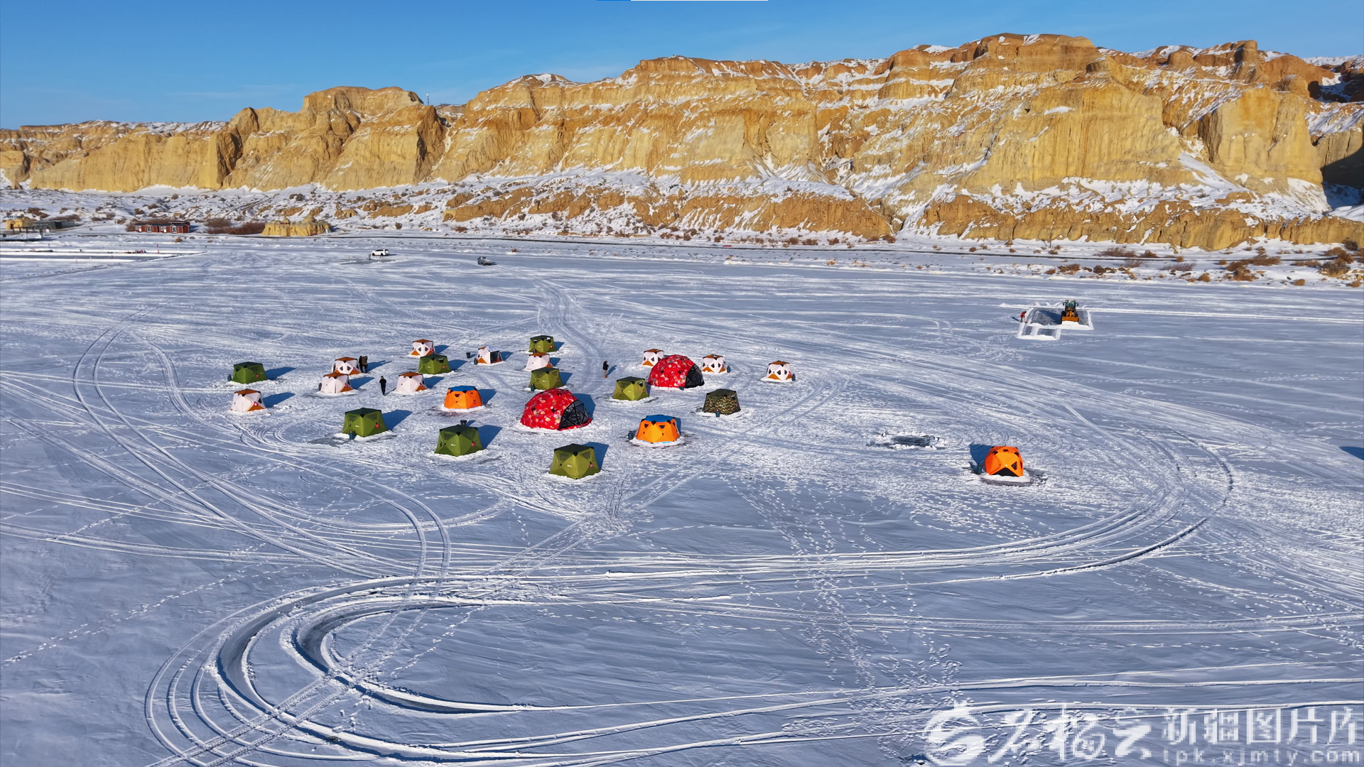 红色、绿色、橙黄色……1月1日,福海县海上魔鬼城景区冰面之上,一顶顶彩色帐篷错落排布,当天景区正式开业的冰钓项目,正吸引着游客前来体验凿冰钓鱼的乐趣。