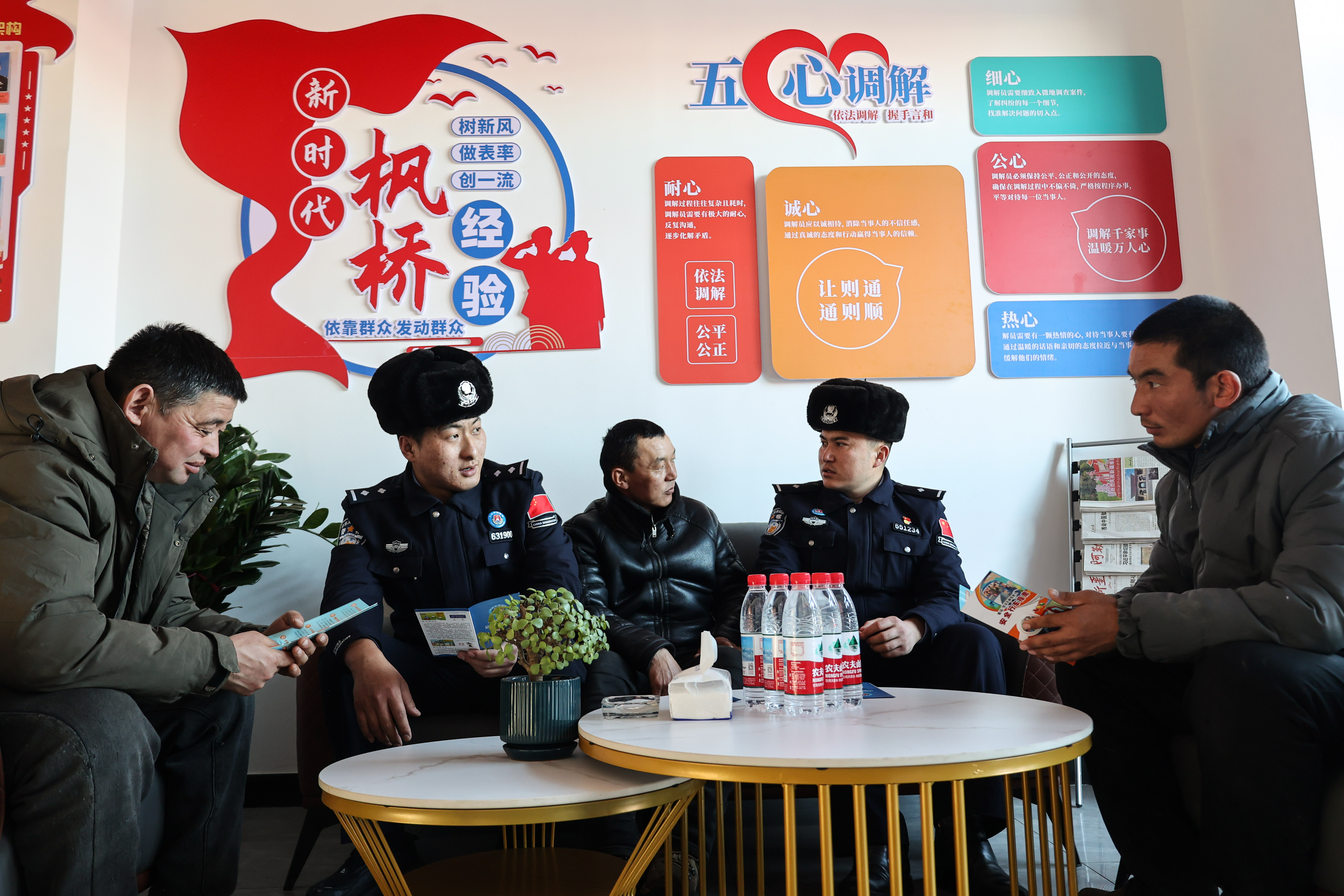 3月7日,新疆阿勒泰边境管理支队阿热勒托别边境派出所“重卡警务驿站”为卡车司机提供服务。通讯员 李晋摄