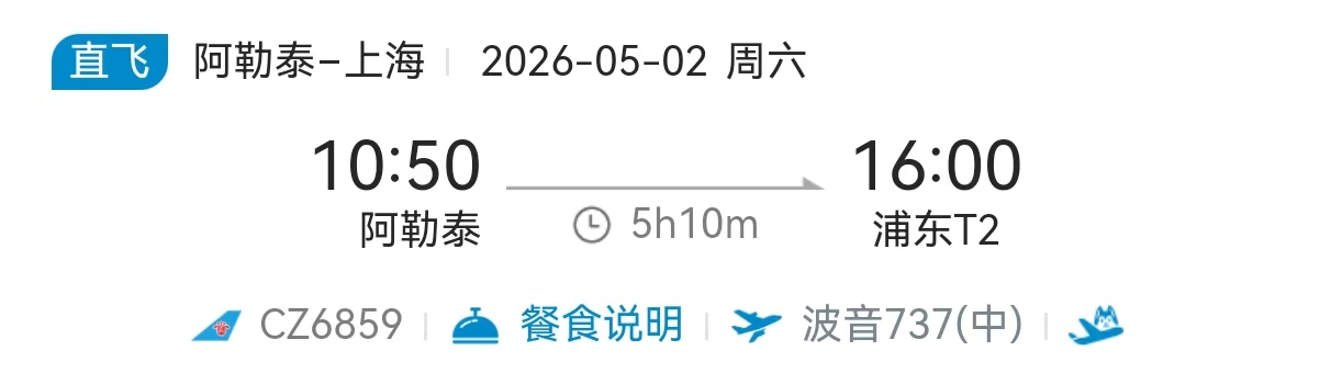 去程航班10:50从阿勒泰起飞