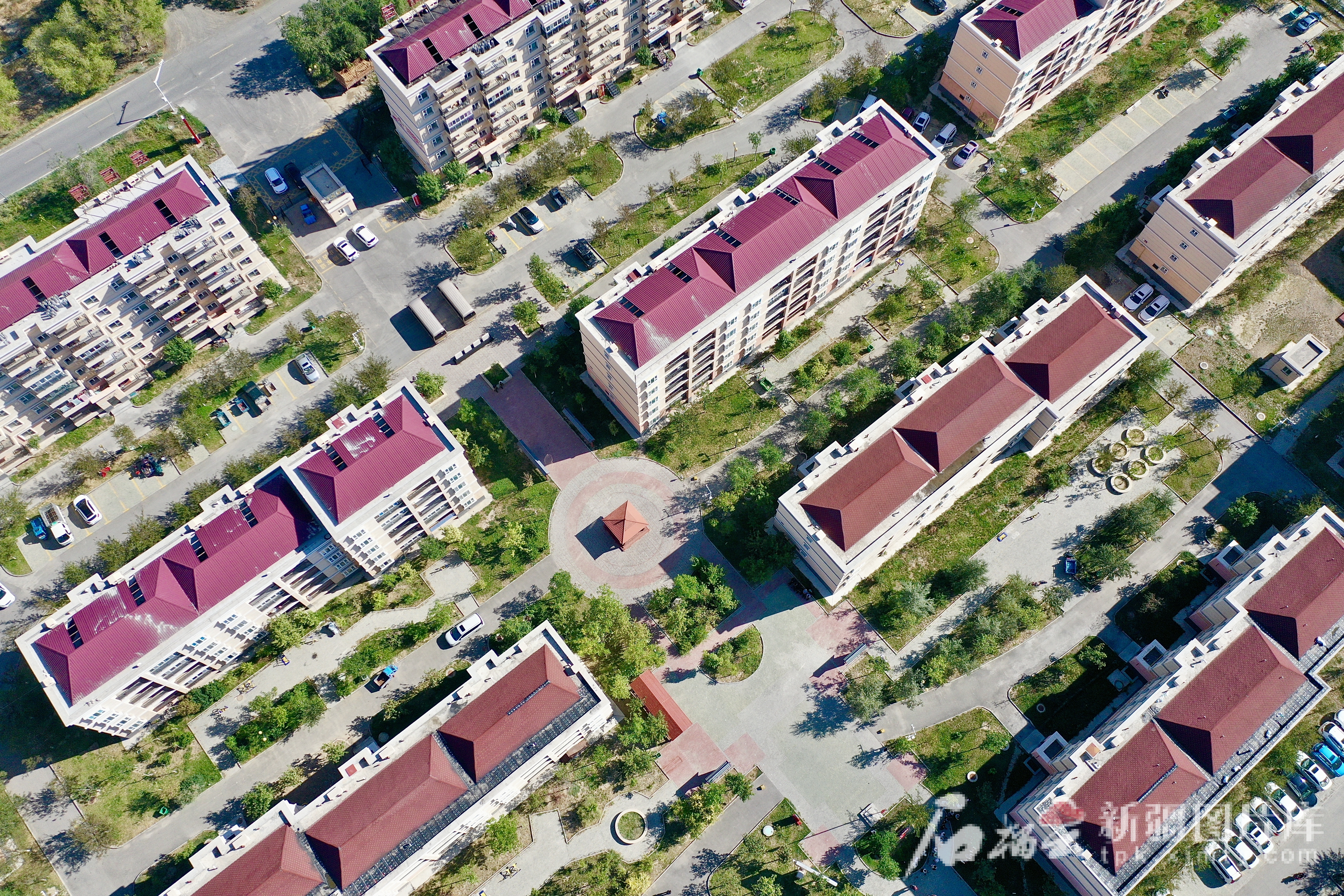8月12日,昌吉市阿什里乡的“天鹅小镇”,一排排整齐的楼房。(无人机摄)