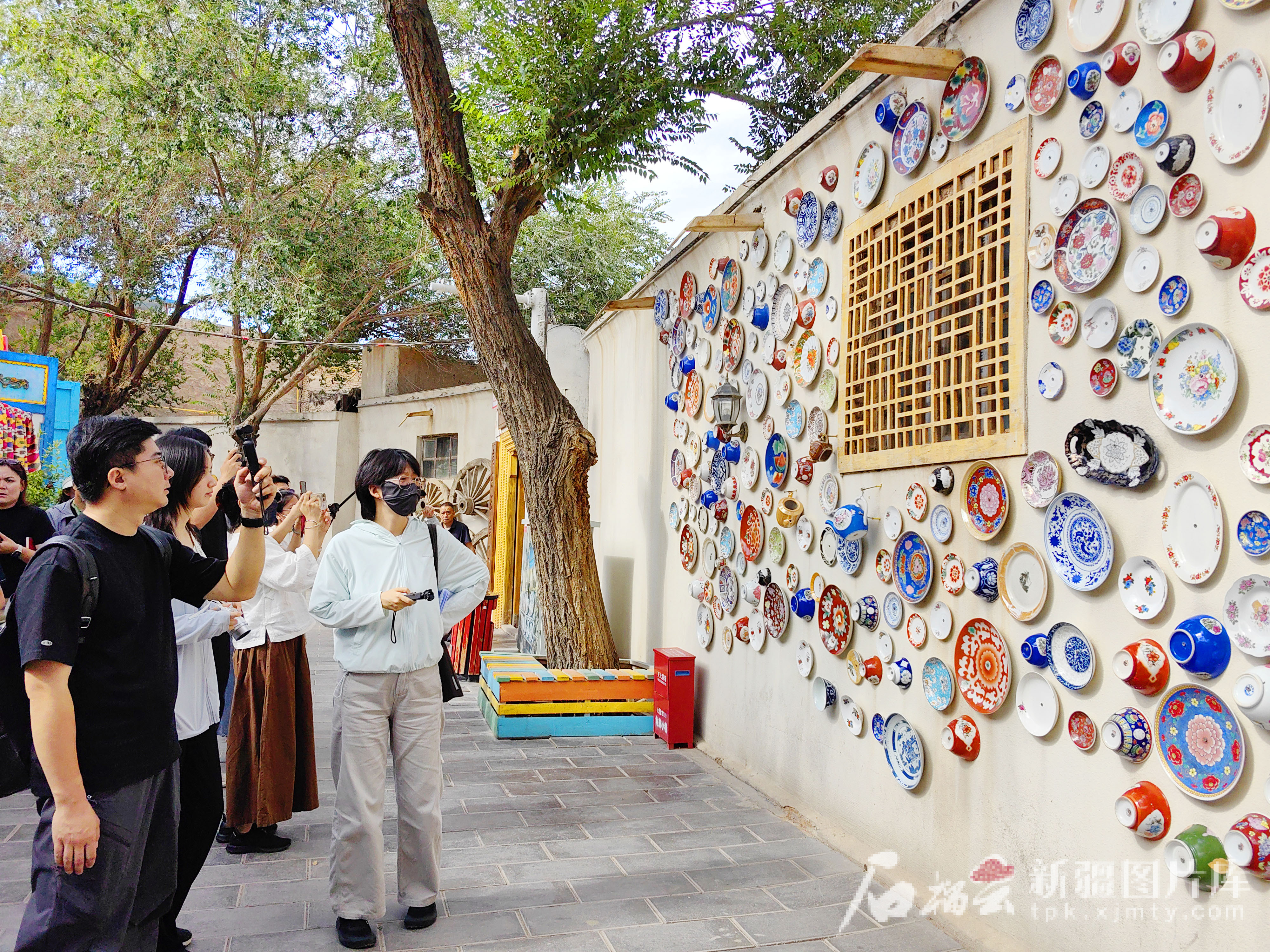 8月13日,采访团在观赏龟兹小巷墙上的装饰品。