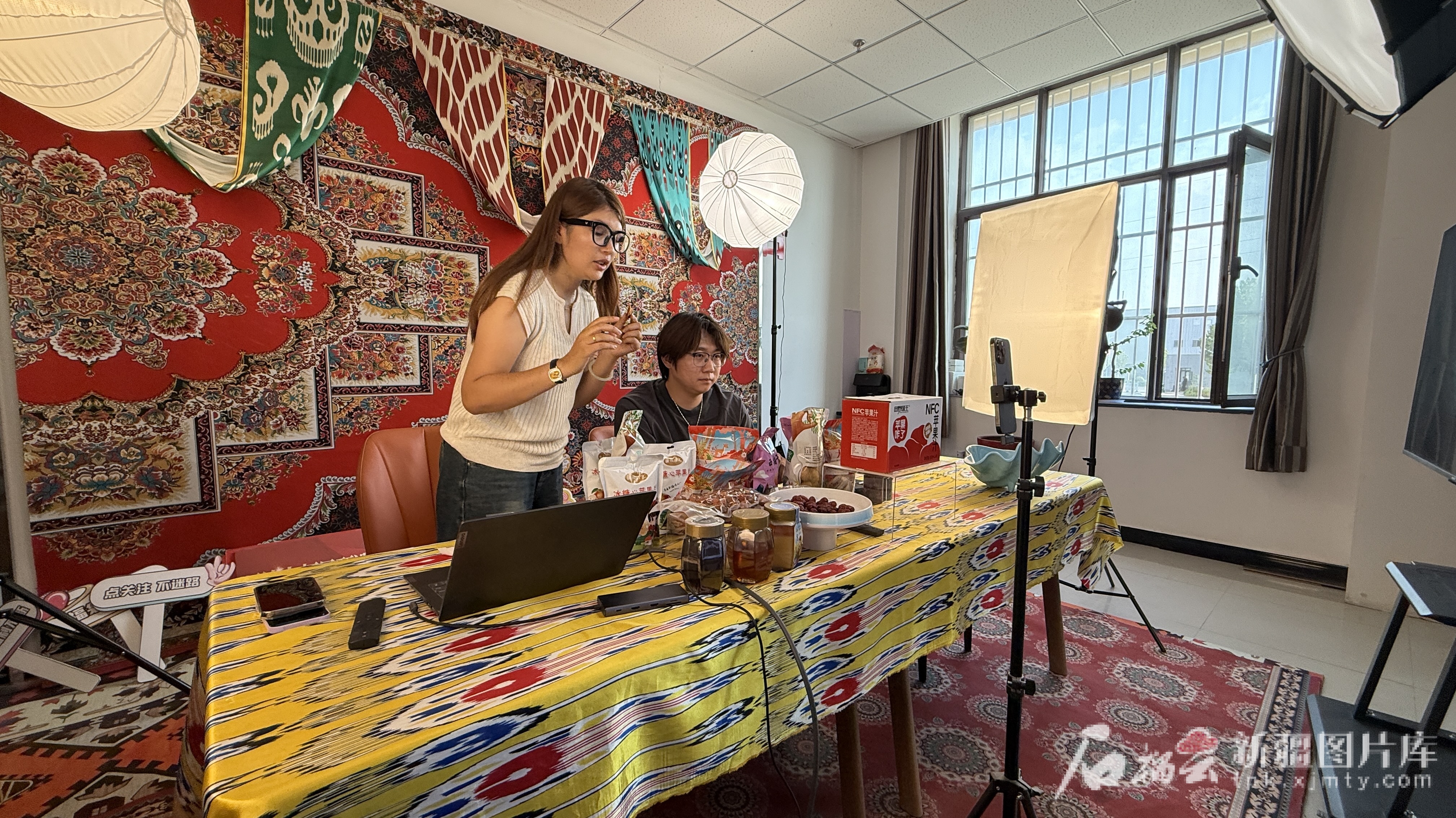 8月13日,在阿克苏市电商创业孵化基地演播室,主播正在推介当地农副产品。石榴云/新疆日报记者 拍热扎提·阿不都 摄