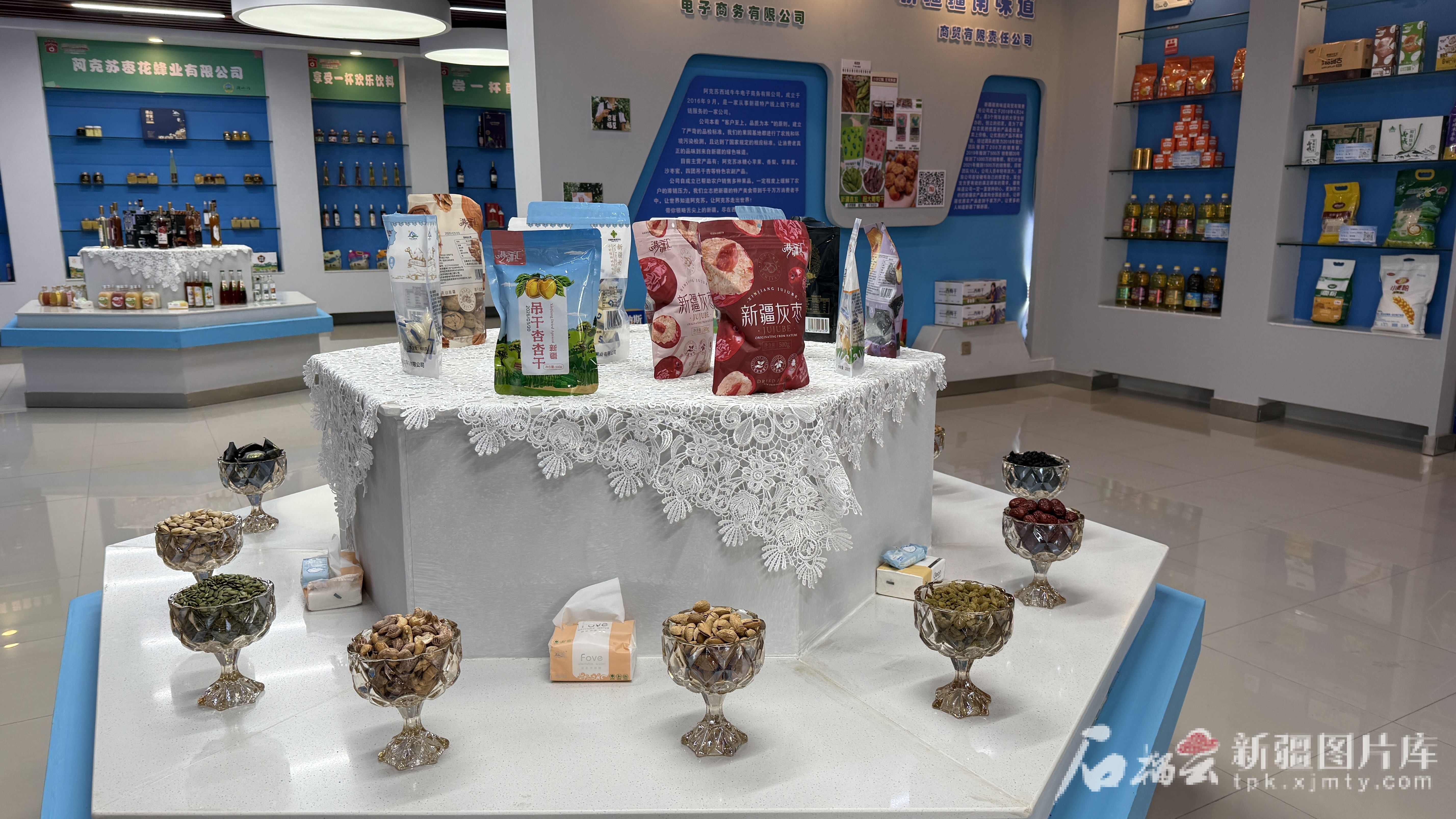 8月13日,阿克苏市电商产业园内农产品展示厅里,入驻企业展示的各类农副产品。石榴云/新疆日报记者 拍热扎提·阿不都 摄