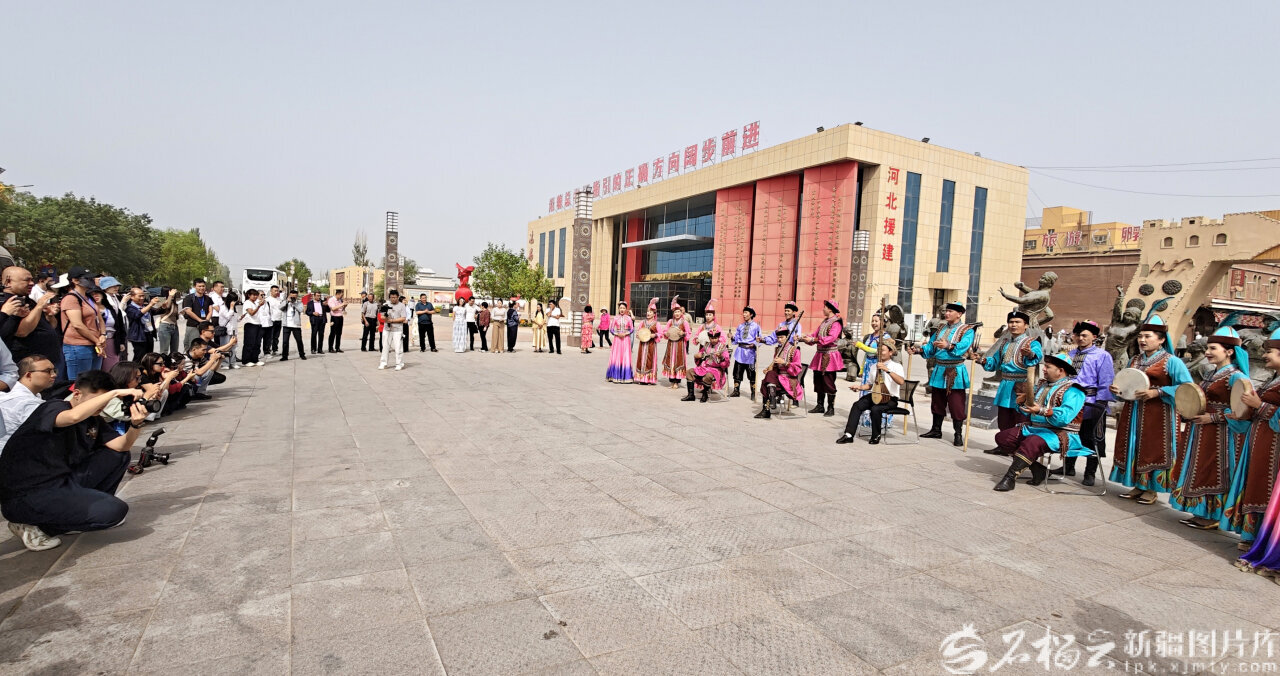 9月9日,“砥砺奋进七十载 天山南北谱华章”大型集中采访活动采访团记者在尉犁县兴平镇达西村拍摄演员表演。