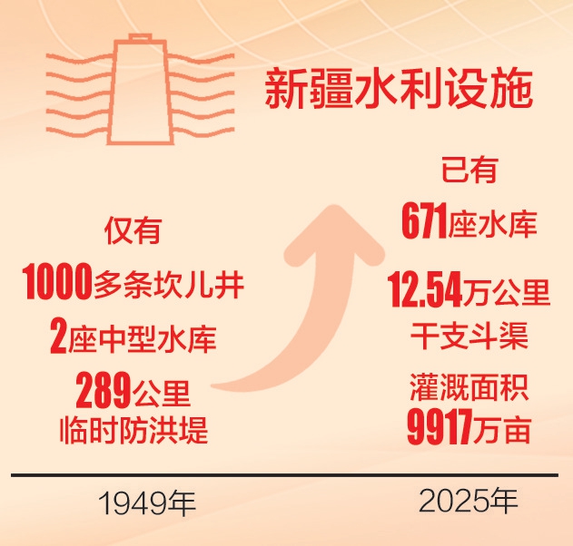 巨变,始于滴水,成于“疆”来。经过70年超3000亿元的投资建设,新疆已建成671座水库、12.54万公里干支斗渠、逾8000公里堤防护岸,灌溉面积达9917万亩,为构筑水旱灾害防御、农业稳产增收和生态屏障奠定了坚实的“水基石”。当前,大石峡水利枢纽、库尔干水利枢纽等5项重大引、调、蓄水工程实现关键节点目标,37座中小型水库加快建设,新疆基础水利设施,浇灌出绿洲与未来的无限可能。