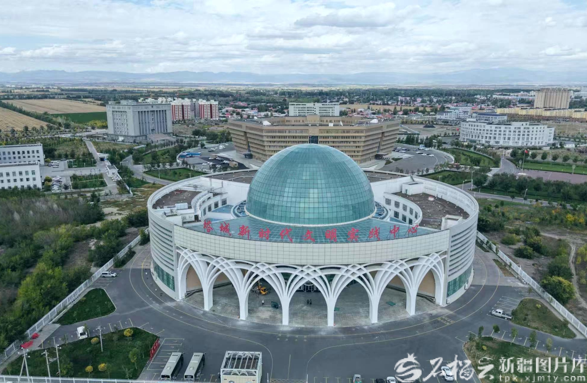 塔城手风琴文化展馆位于塔城新时代文明实践中心一楼。(9月13日无人机摄)