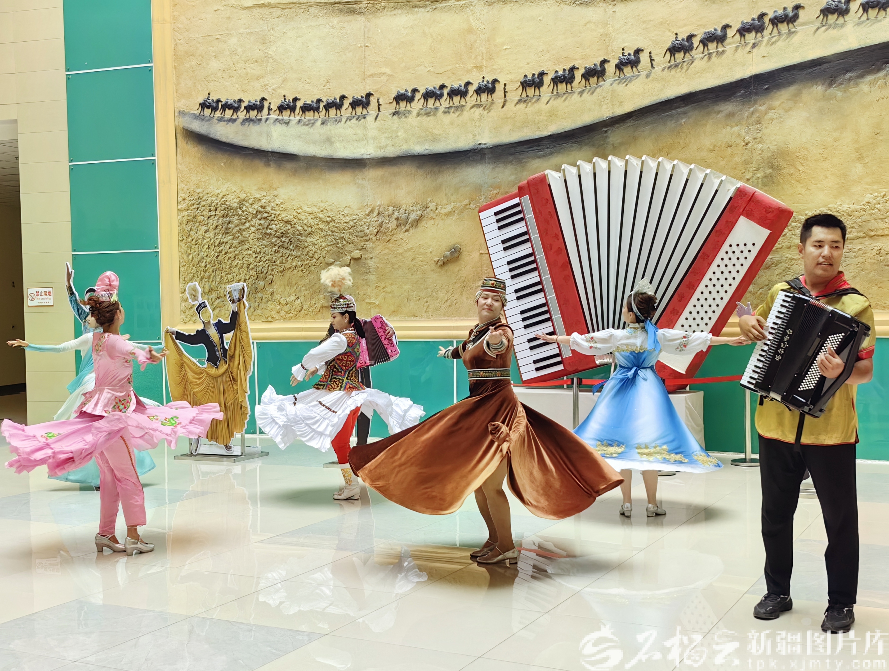 9月13日,演艺人员在塔城手风琴文化展馆载歌载舞。