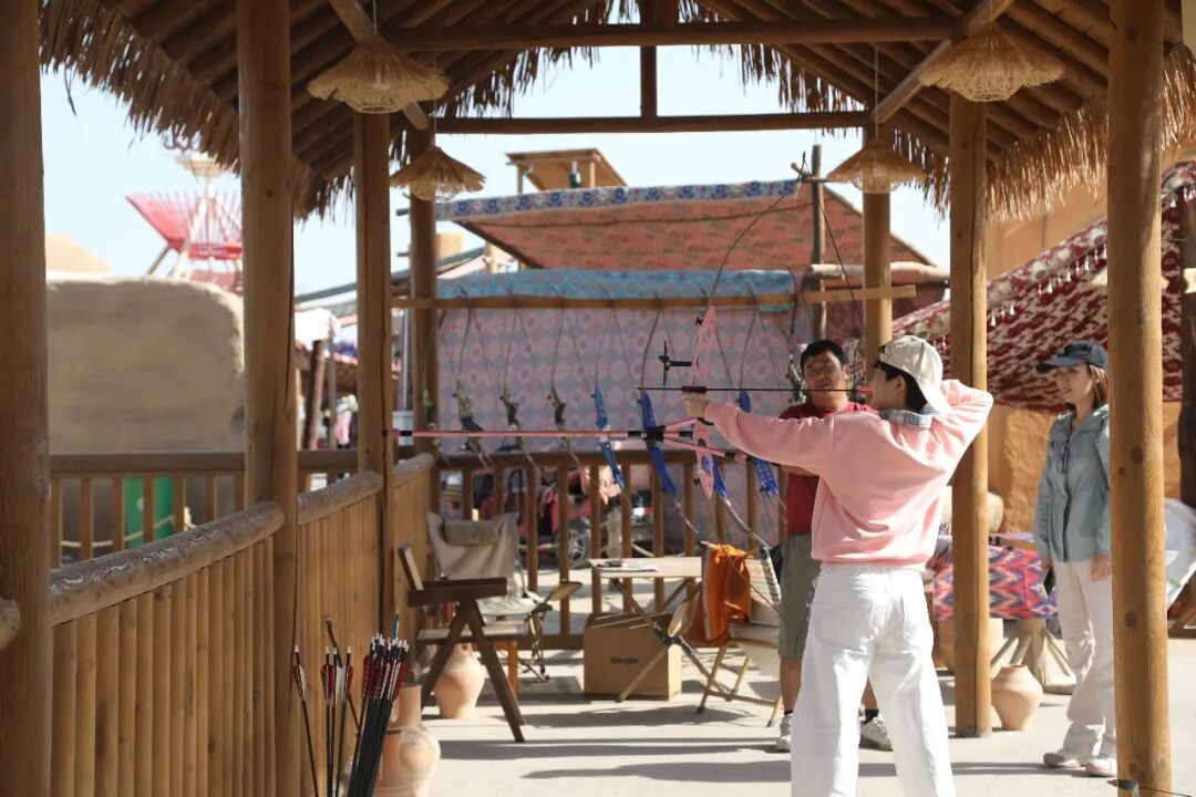 阿不旦广场的各个角落,处处洋溢着热闹的场景。特色水果商铺前,游客们品尝着清甜的香梨,不少人还贴心地将这份美味打包邮寄回家,让远方的亲友共享新疆味道;文创商铺里,家长带着孩子挑选罗布羊玩偶、骆驼摆件、馕包等文创产品;弓箭台前,来自上海的游客正认真学习拉弓射箭,体验着传统体育运动的乐趣;“尉犁供销”摊位上,罗布麻茶、罗布麻蜜等特色产品琳琅满目,令人目不暇接。