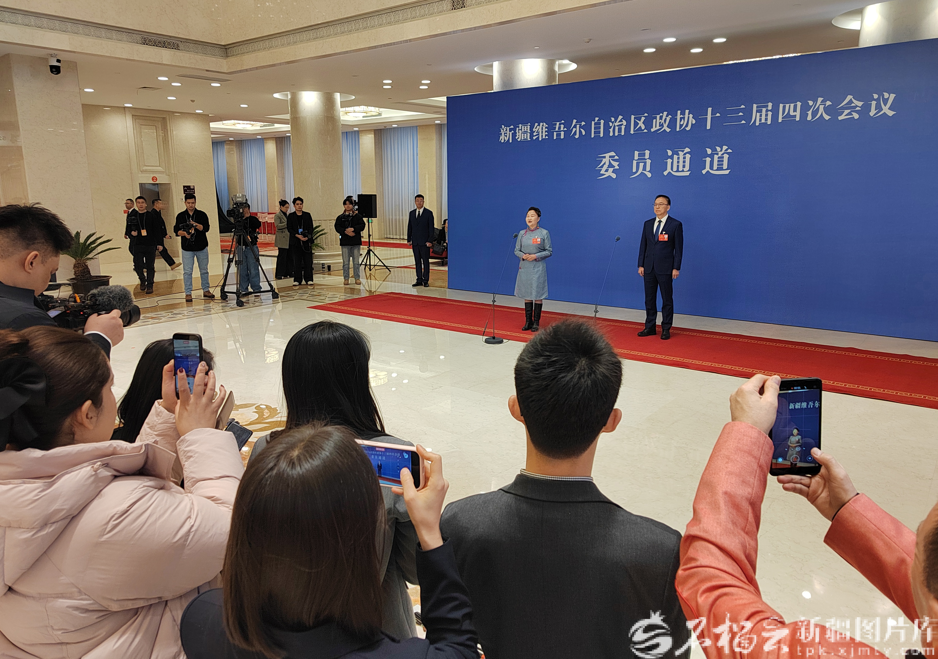 1月26日,自治区政协十三届四次会议“委员通道”集体采访活动现场,王西华、阿米娜·乌拉孜哈力两位委员接受媒体记者采访。石榴云/新疆日报记者 邹懿摄