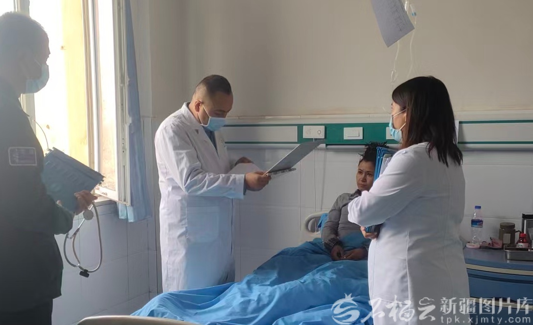 2月26日,皮山县藏桂乡卫生院,麦木提敏 ·托依巴柯(左二)正在查房,了解患者诊疗情况。图片由皮山县藏桂乡卫生院提供