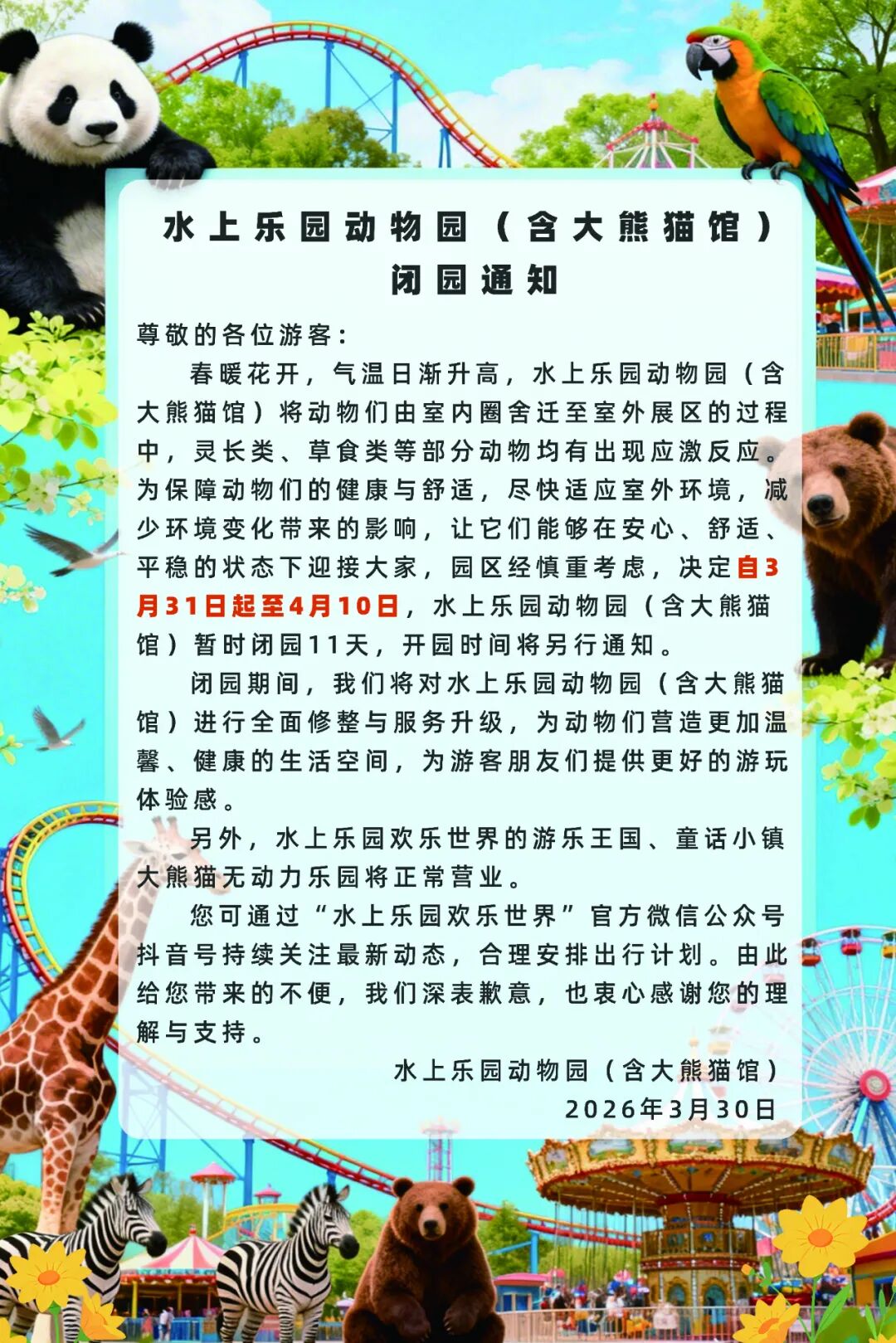 通知中称,气温日渐升高,水上乐园动物园(含大熊猫馆)将动物们由室内圈舍迁至室外展区过程中,部分动物出现应激反应。为保障动物们的健康与舒适,尽快适应室外环境,减少环境变化带来的影响,让它们在安心、舒适、平稳的状态下迎接大家,园区经过慎重考虑,决定暂时闭园11天。
